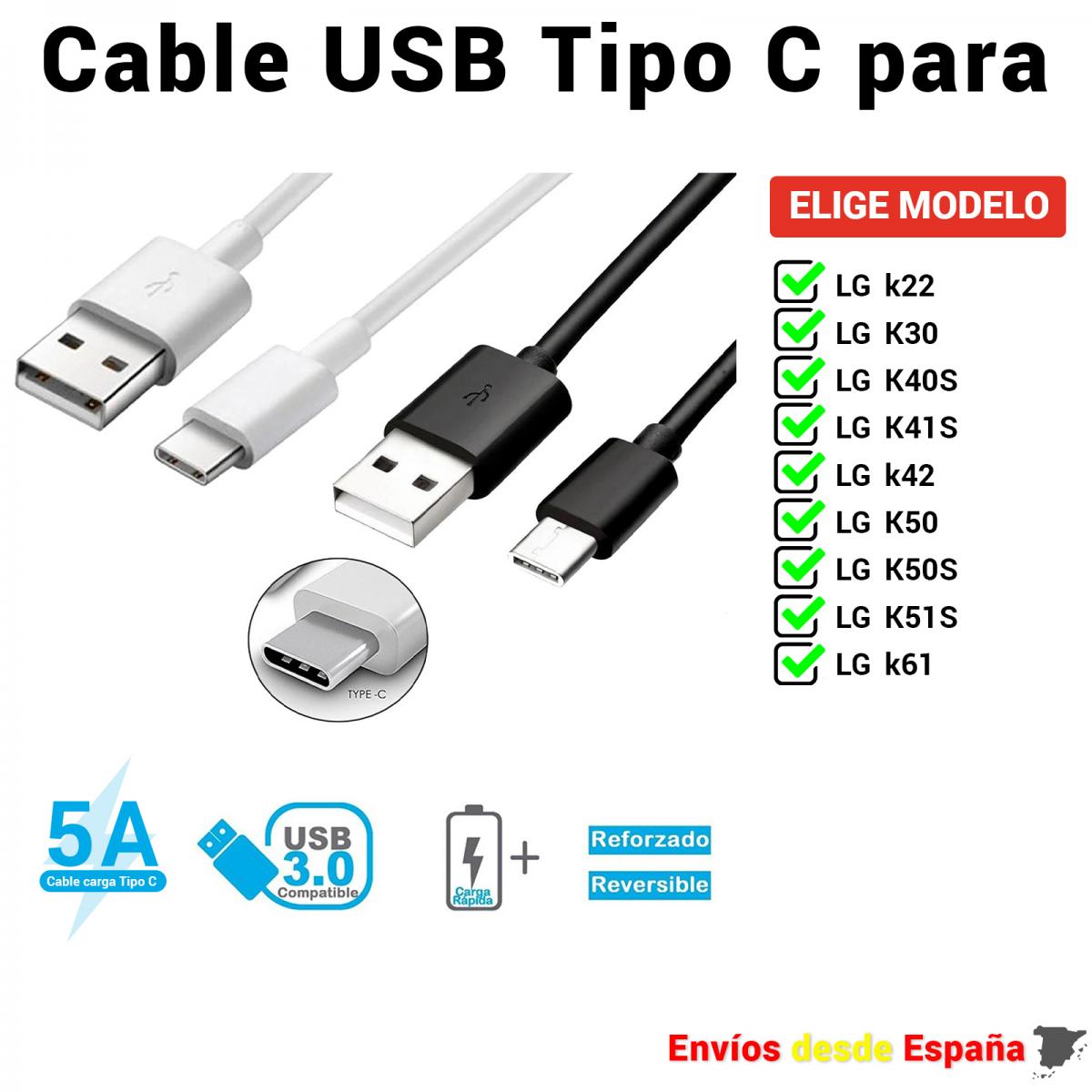 Cable USB Tipo C para LG k22 K30 K40 K40S K41S k42 K50 K50S K51S k61 de Carga rapida y Datos para móviles de 1 metro y 2 metros