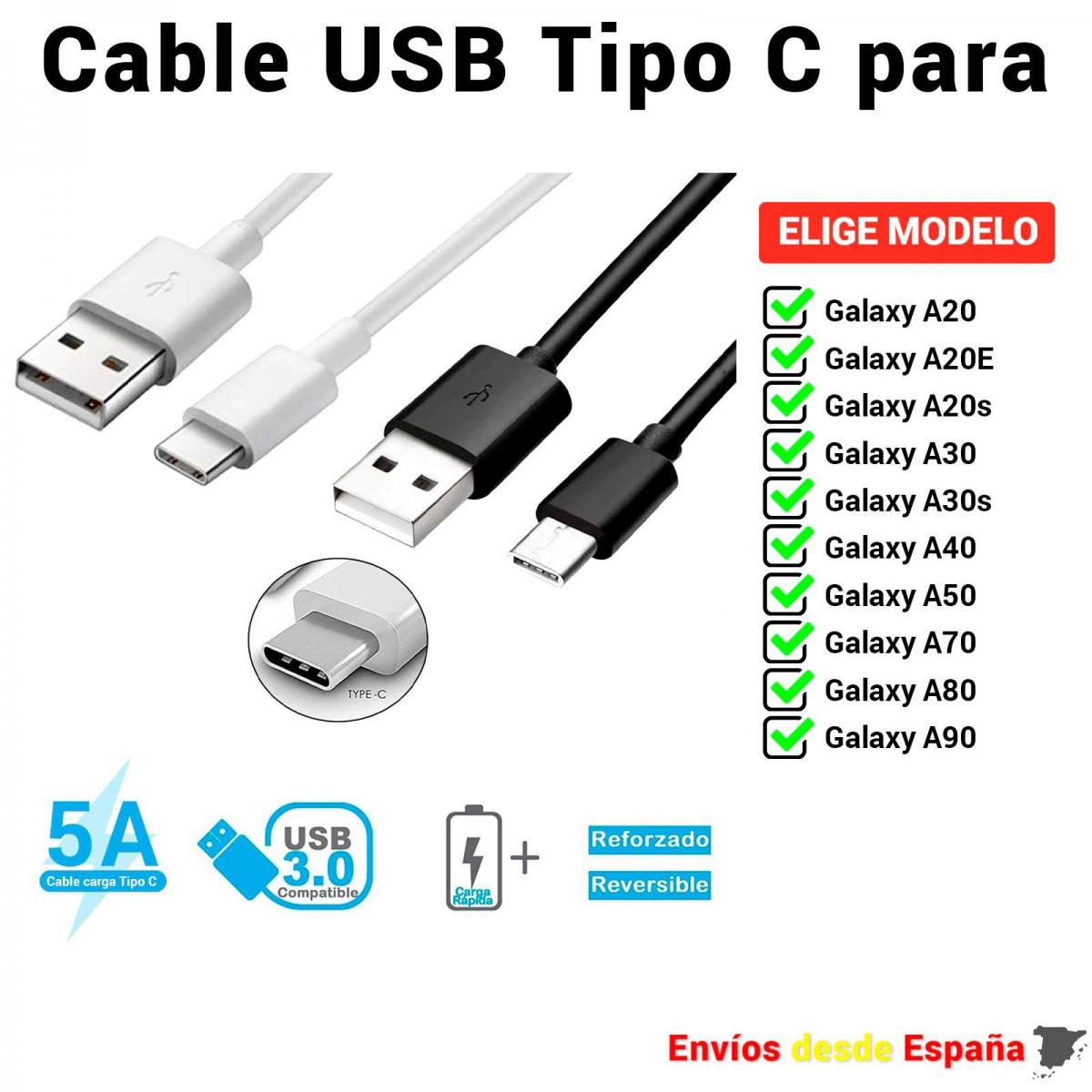 Cable USB Tipo C para Samsung Galaxy A20 A20E A20s A30 A30s de Carga rapida y Datos para móviles de 1 metro y 2 metros