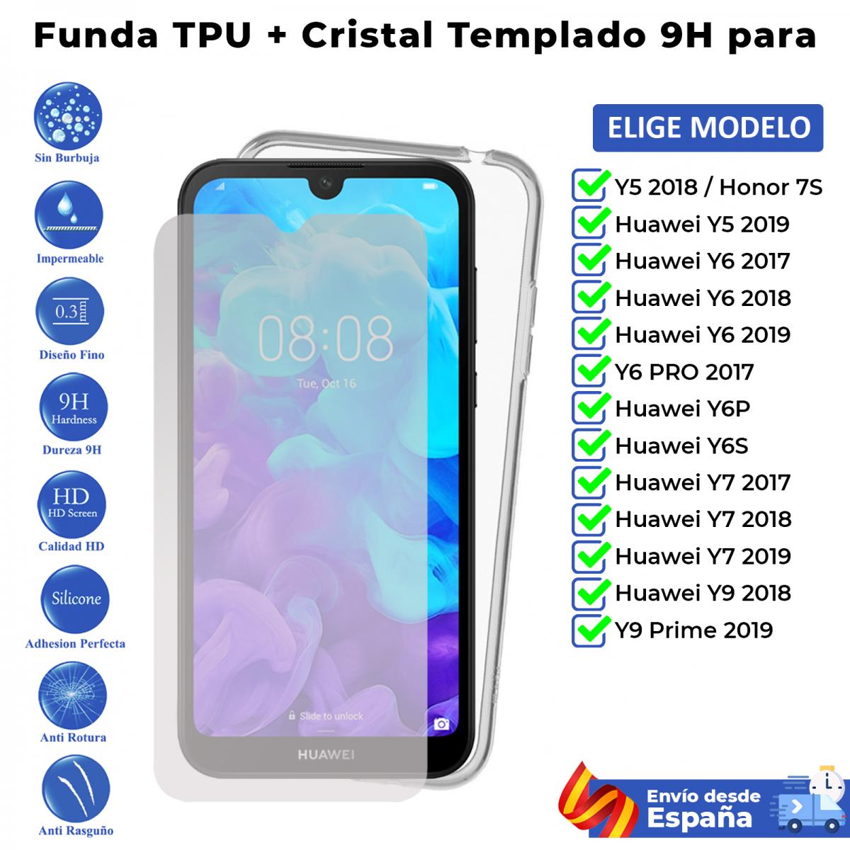 Funda y protector para Huawei Y5 Y6 Y6P Y6S Y7 Y9 2017 2018 2019 Pro Prime. Cristal templado de pantalla y carcasa transparente