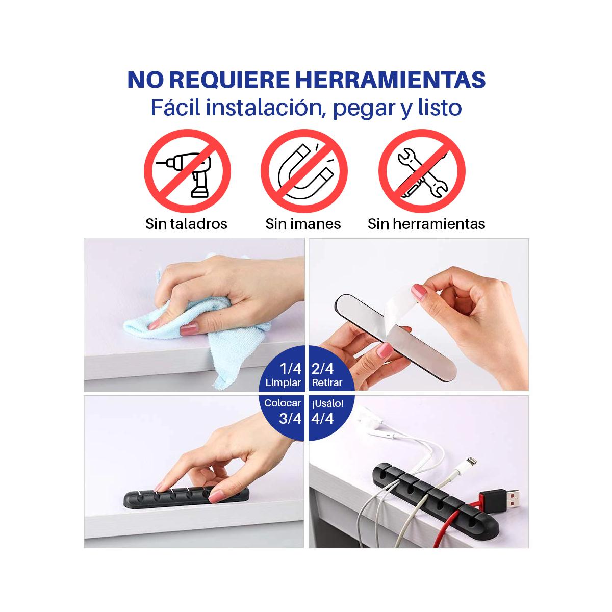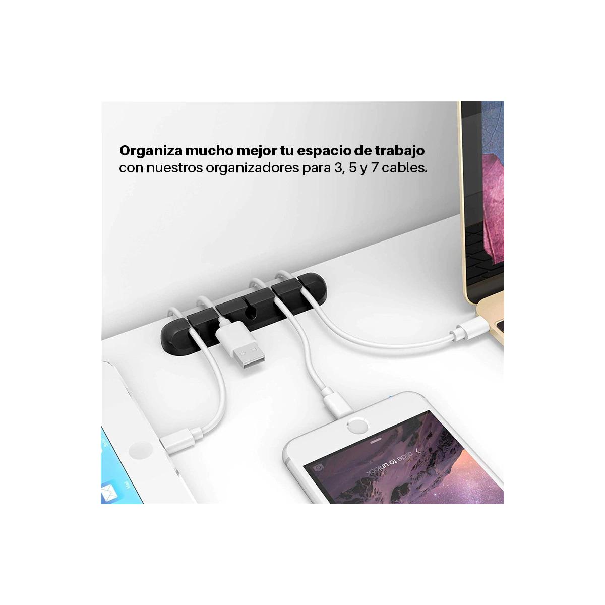 Organiza mucho mejor tu espacio de trabajo con nuestros prácticos organizadores. Son muy fáciles de instalar, su capa de pegamento extrafuerte consigue una fijación duradera. Sirve para todo tipo de cables: HDMI, Cargadores, Altavoces... y puedes colocarlo sobre cualquier superficie.